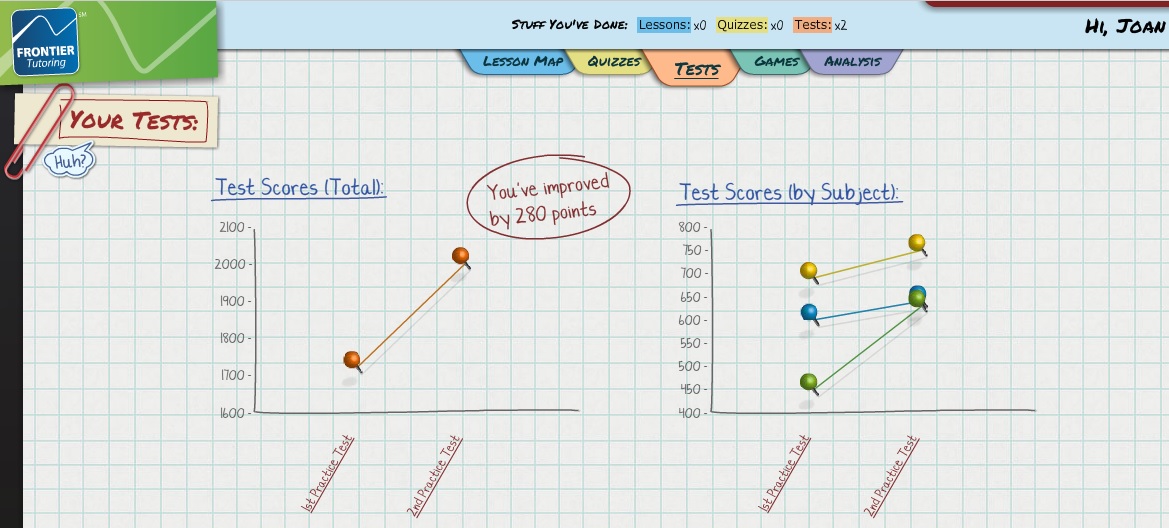 Upon completion of the full-length practice test, we generate a custom score report with detailed analytics about the student's performance and the specific question types where he or she has the highest opportunity for score improvement. Additionally, throughout the program, we monitor the student's performance on practice problems completed on our online SAT/ACT prep portal. |